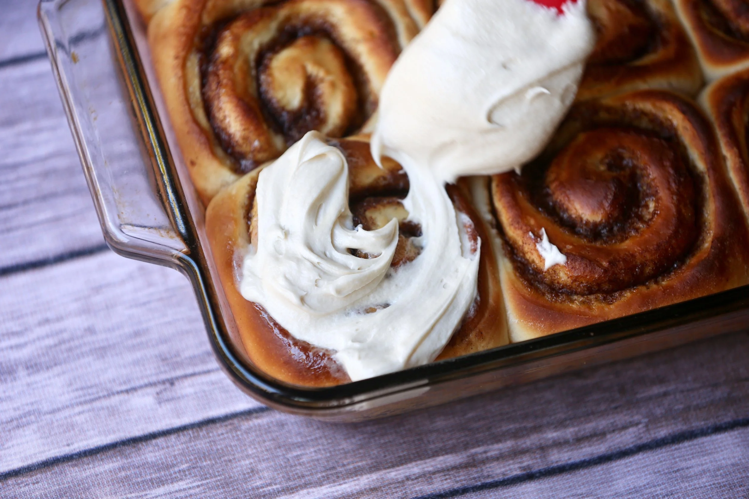 - Once you remove the buns from the oven, let sit for 10 minutes before spreading with icing.
