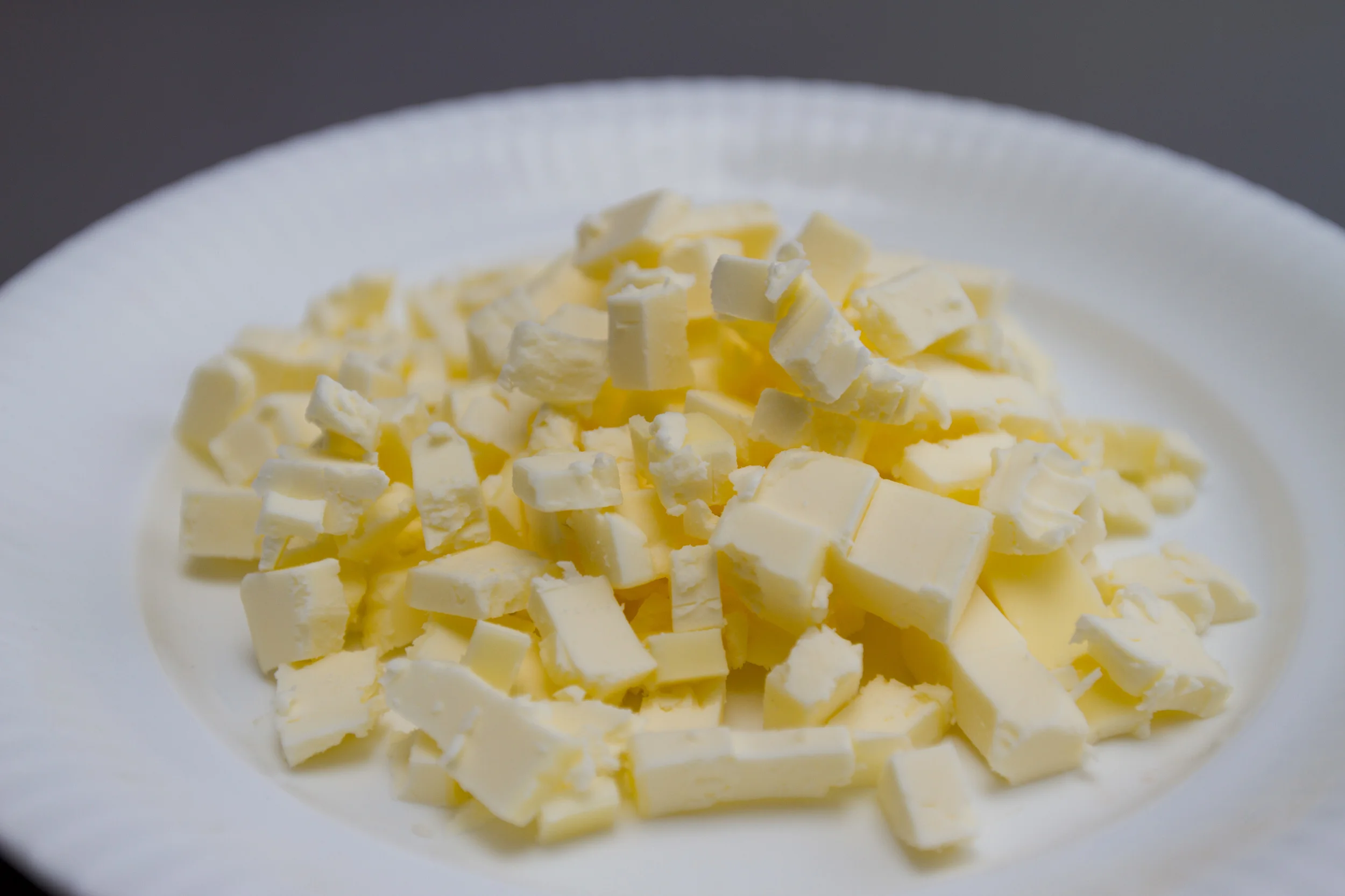 - Cut up your cold butter into small pieces (reference the photo above for size)