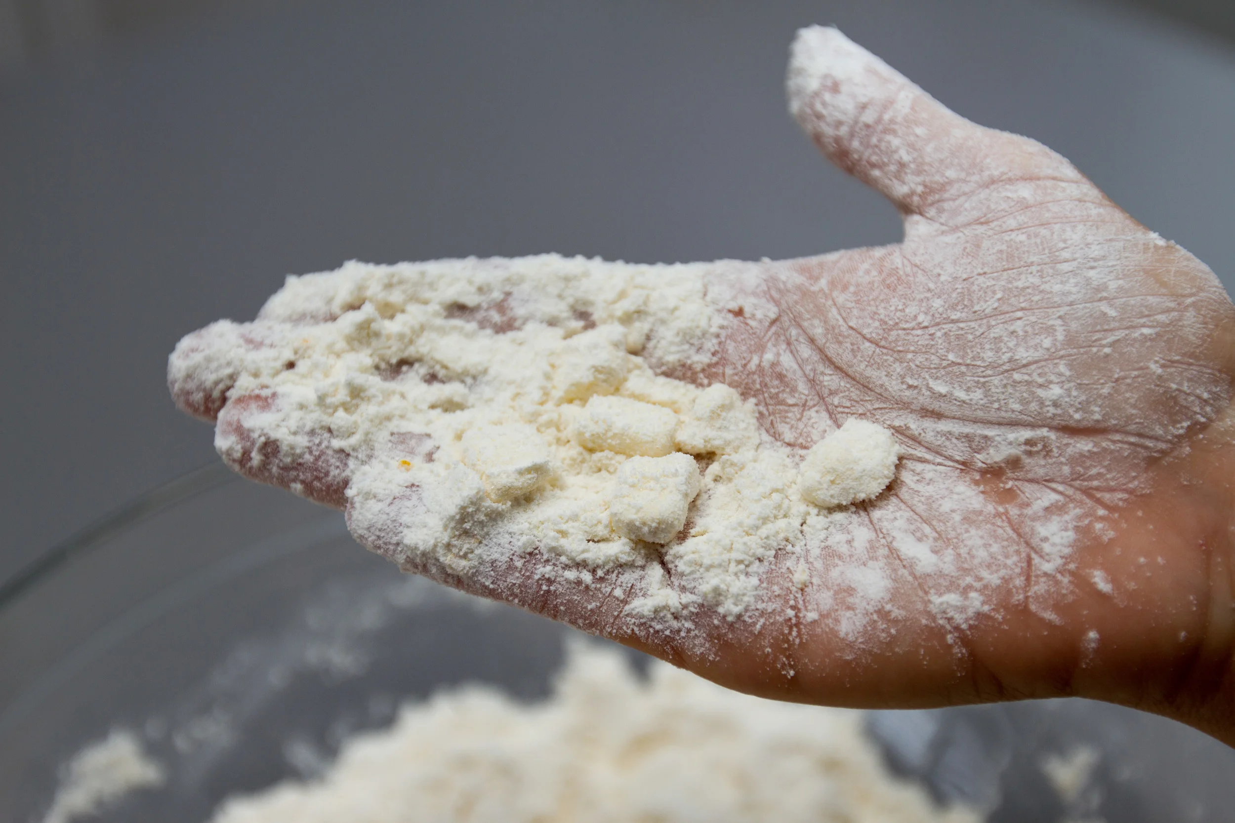 - Add cold butter and work into the flour mixture until the biggest pieces are the size of small peas with your fingertips. It's important that you move fast and make sure your butter doesn't melt. The cold butter is what makes your scones flaky!